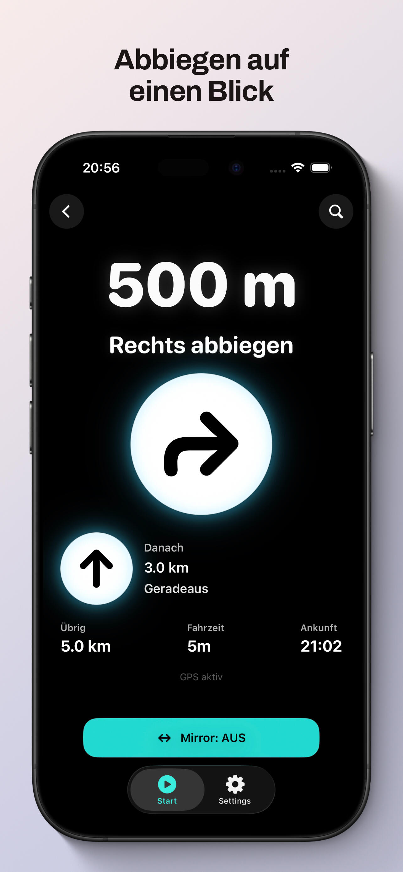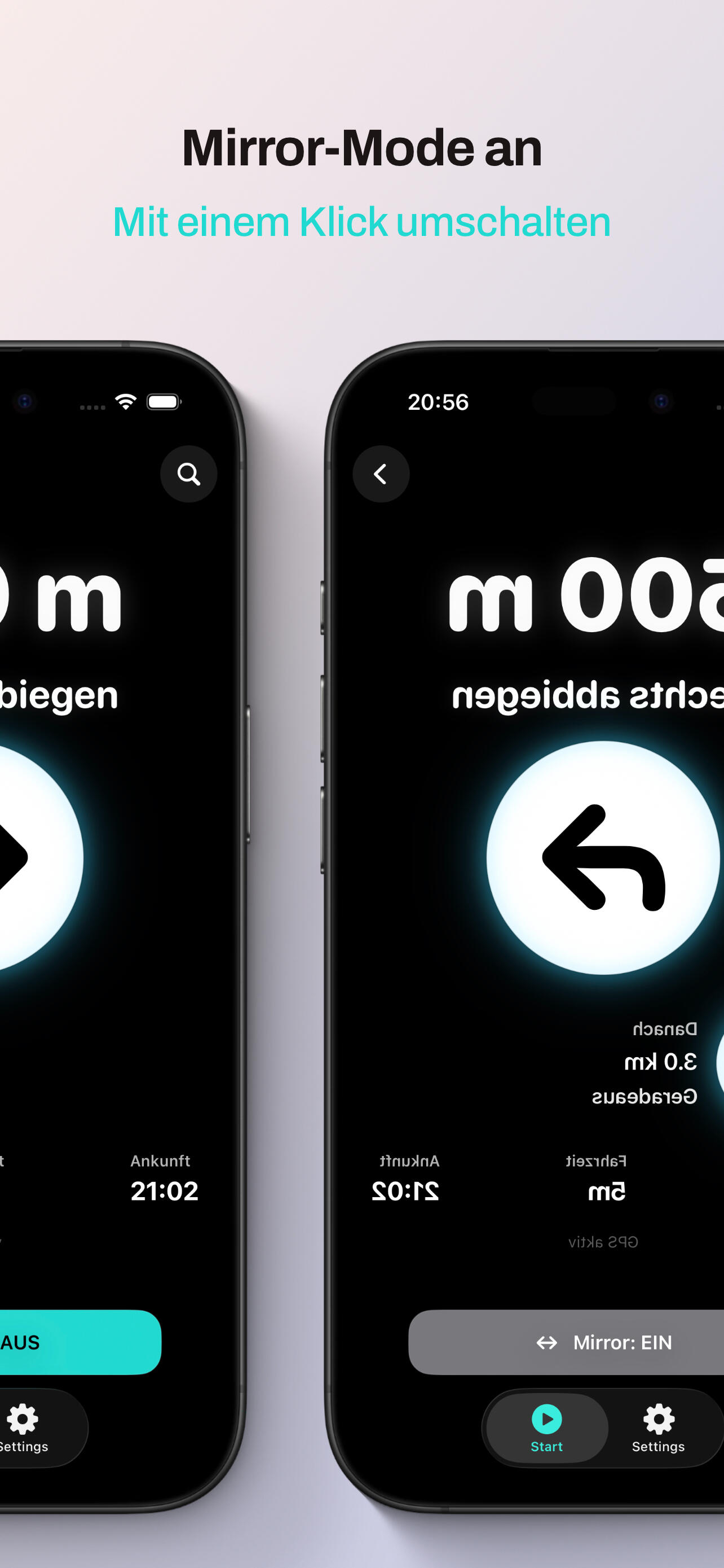 3. Tippe auf „Mirror“, platziere dein Smartphone nahe an der Windschutzscheibe und folge der Spiegelung.SICHERHEIT
